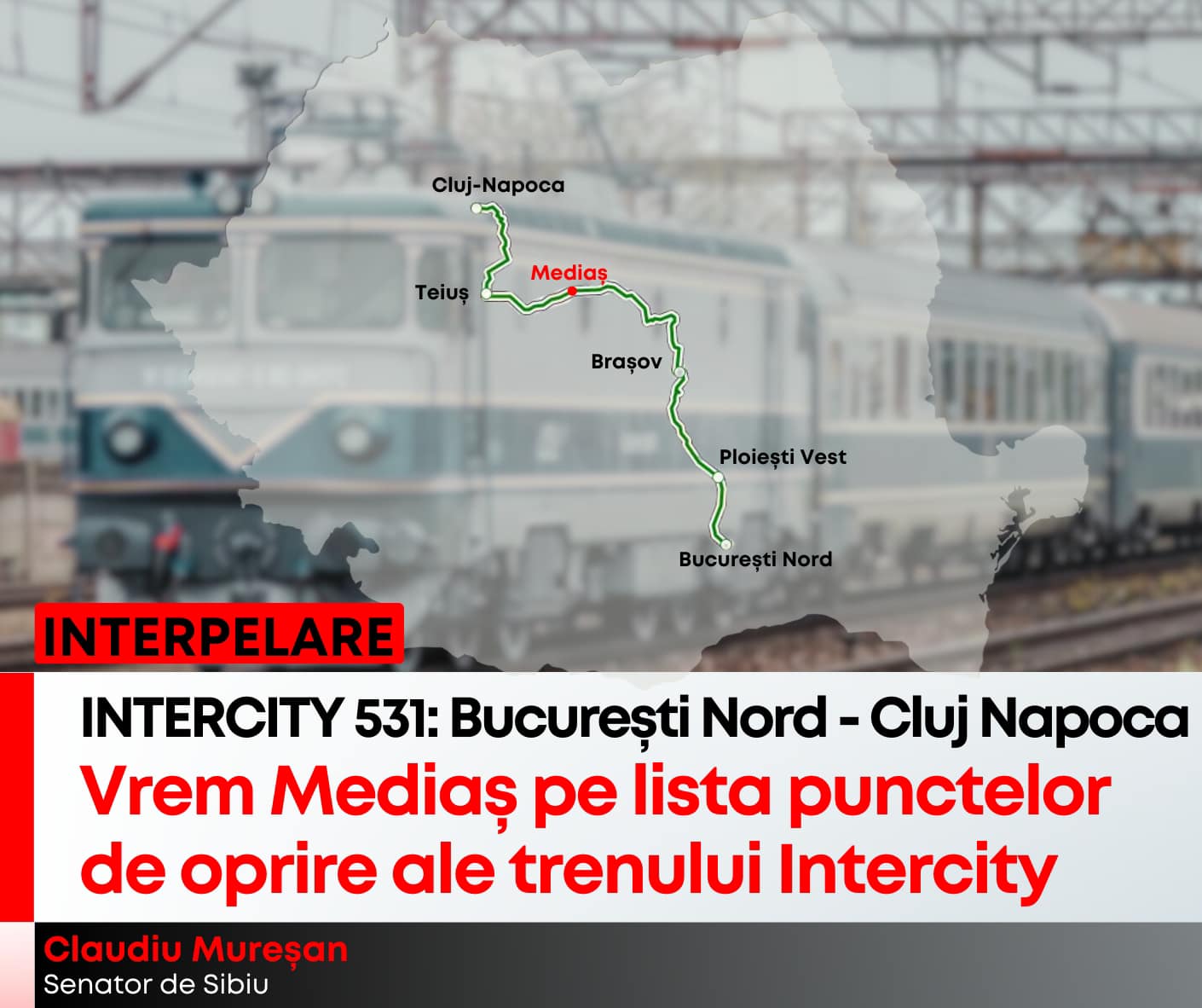 Am transmis, astăzi, o interpelare Companiei de Căi Ferate și Ministerului Transporturilor, solicitându-le să includă Mediaș pe lista stațiilor în care să oprească trenul Intercity.
