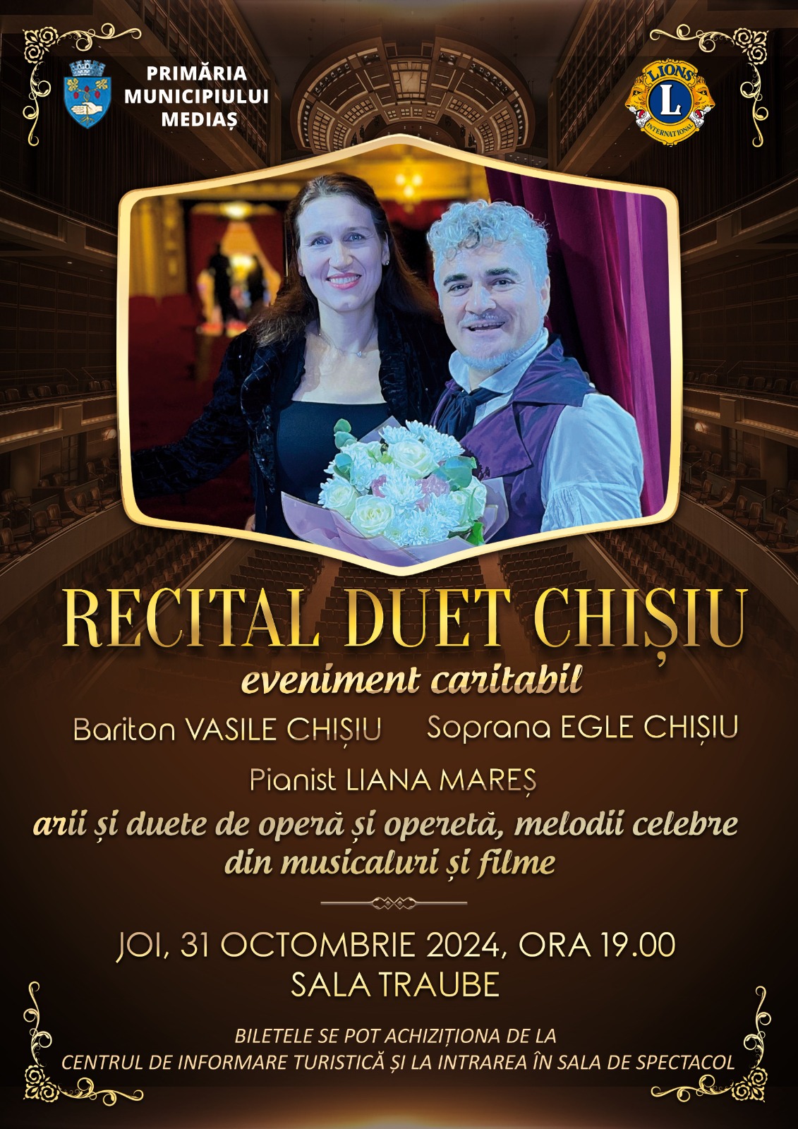 Primăria Municipiului Mediaș, prin Direcția pentru Cultură, în colaborare cu Clubul Lions, organizează un concert caritabil joi, 31 octombrie 2024, la Sala Traube din Mediaș.