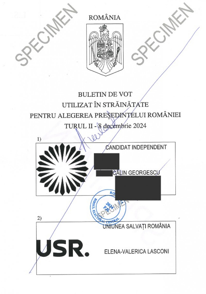 Biroul Electoral Central (BEC) a stabilit, luni seară, machetele buletinelor de vot pentru turul al doilea al alegerilor prezidențiale, programat pe 8 decembrie 2024. Candidații care se vor regăsi pe buletinele de vot sunt Călin Georgescu (independent) și Elena Lasconi (USR).