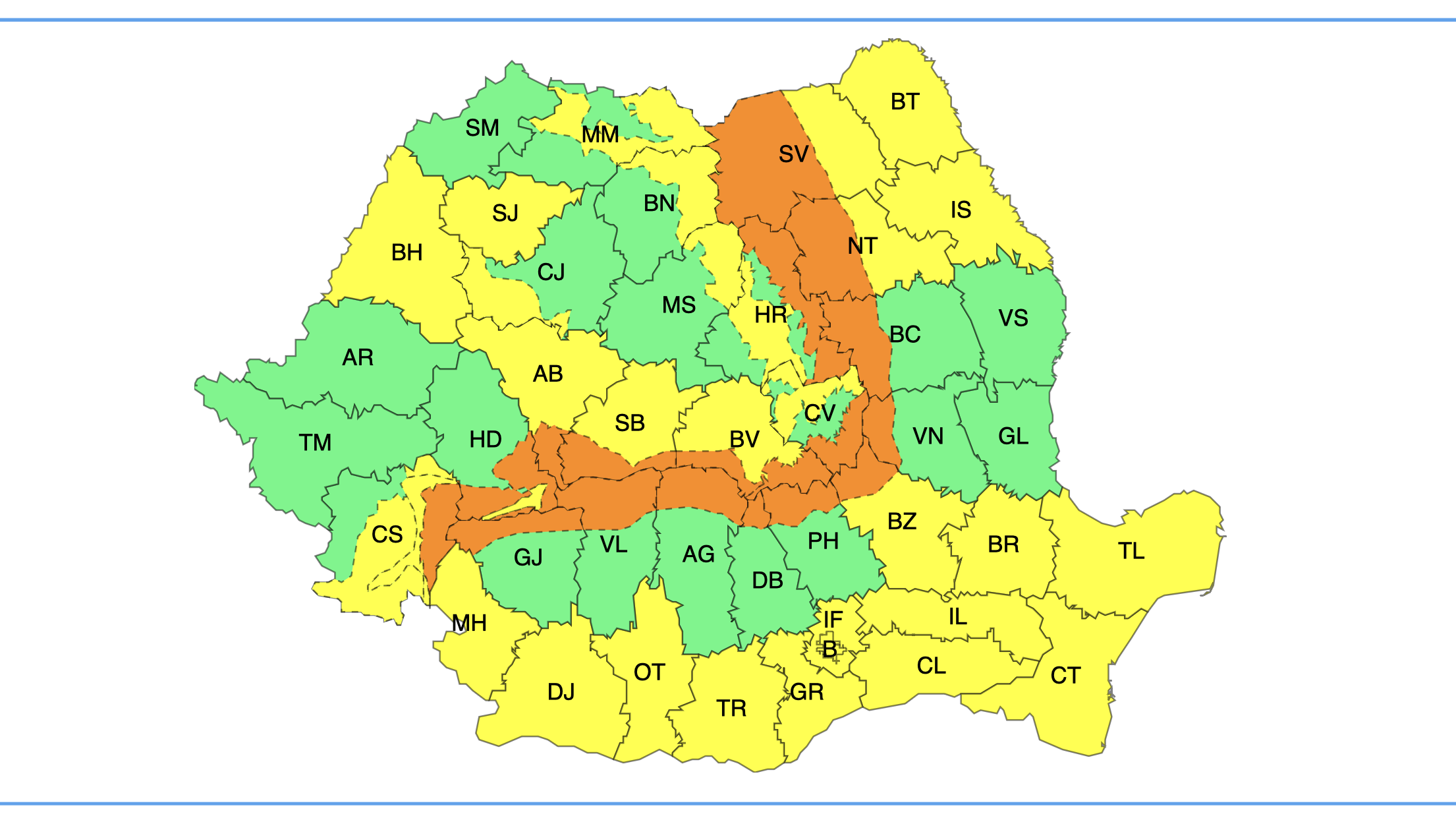 Cod Galben de intensificări ale vântului și polei este valabil pentru zona de munte, unde vântul va atinge rafale de 60-90 km/h. Precipitațiile mixte vor favoriza formarea de polei, iar la altitudini de peste 1600 m vor predomina ninsorile și viscolul.