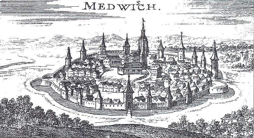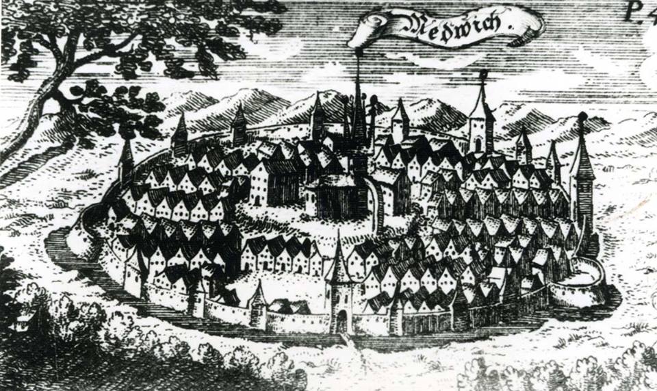 Mediaș, oraș cu bogată tradiție și istorie, este ilustrat în unele dintre cele mai vechi gravuri care i-au fost atribuite cu certitudine. Cea mai veche dintre acestea a fost realizată în 1666 de Hans Jacob Schollenberger și publicată în lucrarea Das Alt und Neu Teutsch Dacia de Johannes Tröster, la Nürnberg.
