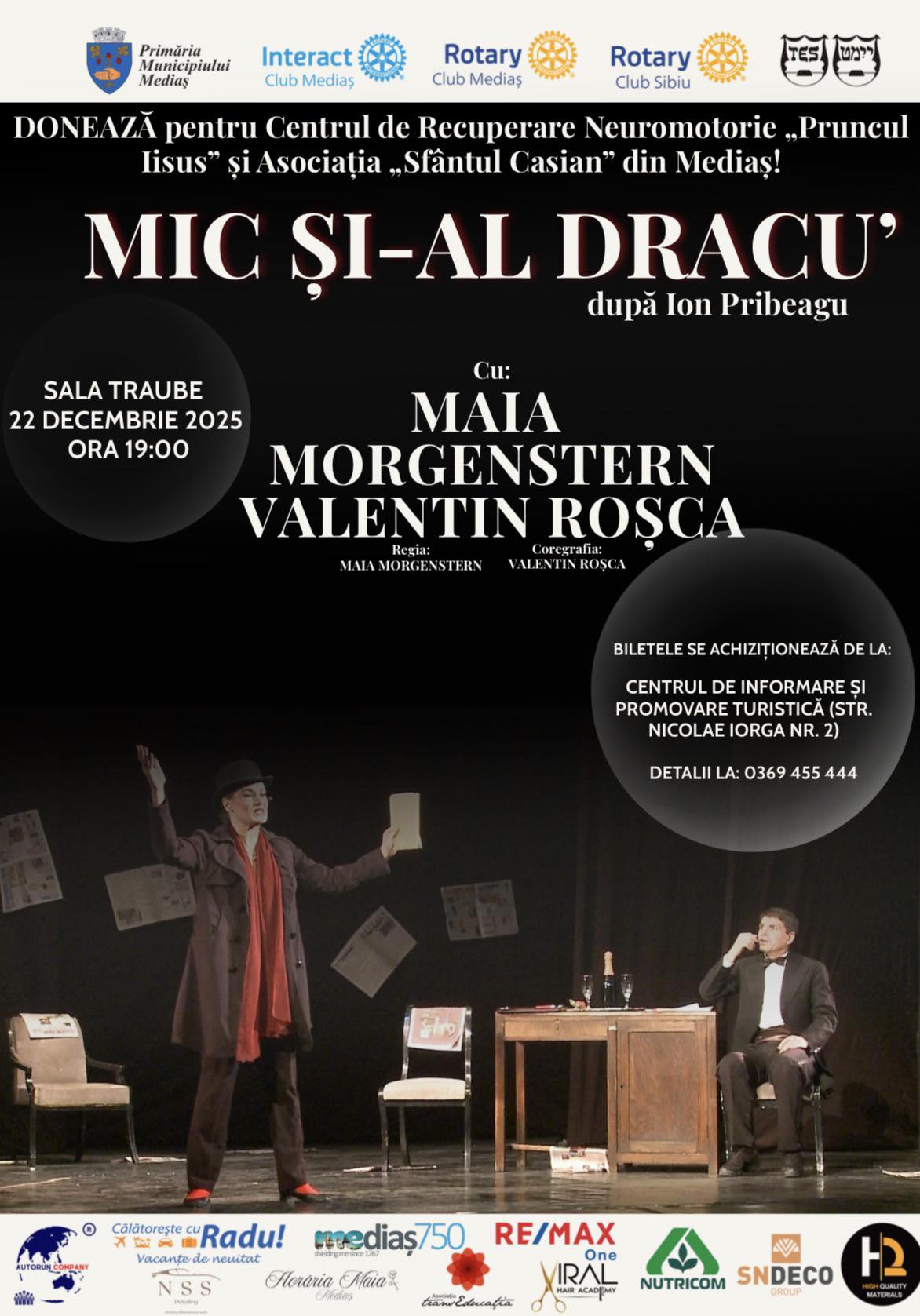 Luni, 22 decembrie, de la ora 19:00, la Sala Traube din Mediaș, publicul este invitat la spectacolul de teatru „Mic și-al dracu”, o producție regizată de Maia Morgenstern, cu coregrafia semnată de Valentin Roșca.