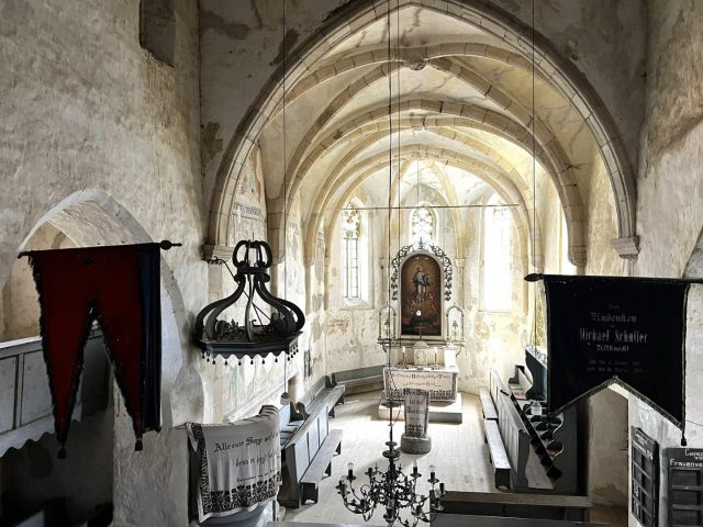 Interiorul ascunde o frescă valoroasă, ținută timp de secole sub un strat de var, care ilustrează scene biblice precum Cina cea de Taină sau intrarea în Ierusalim. De asemenea, orga veche încă funcțională și clopotele istorice – unul datând chiar din 1310 – completează farmecul locului.